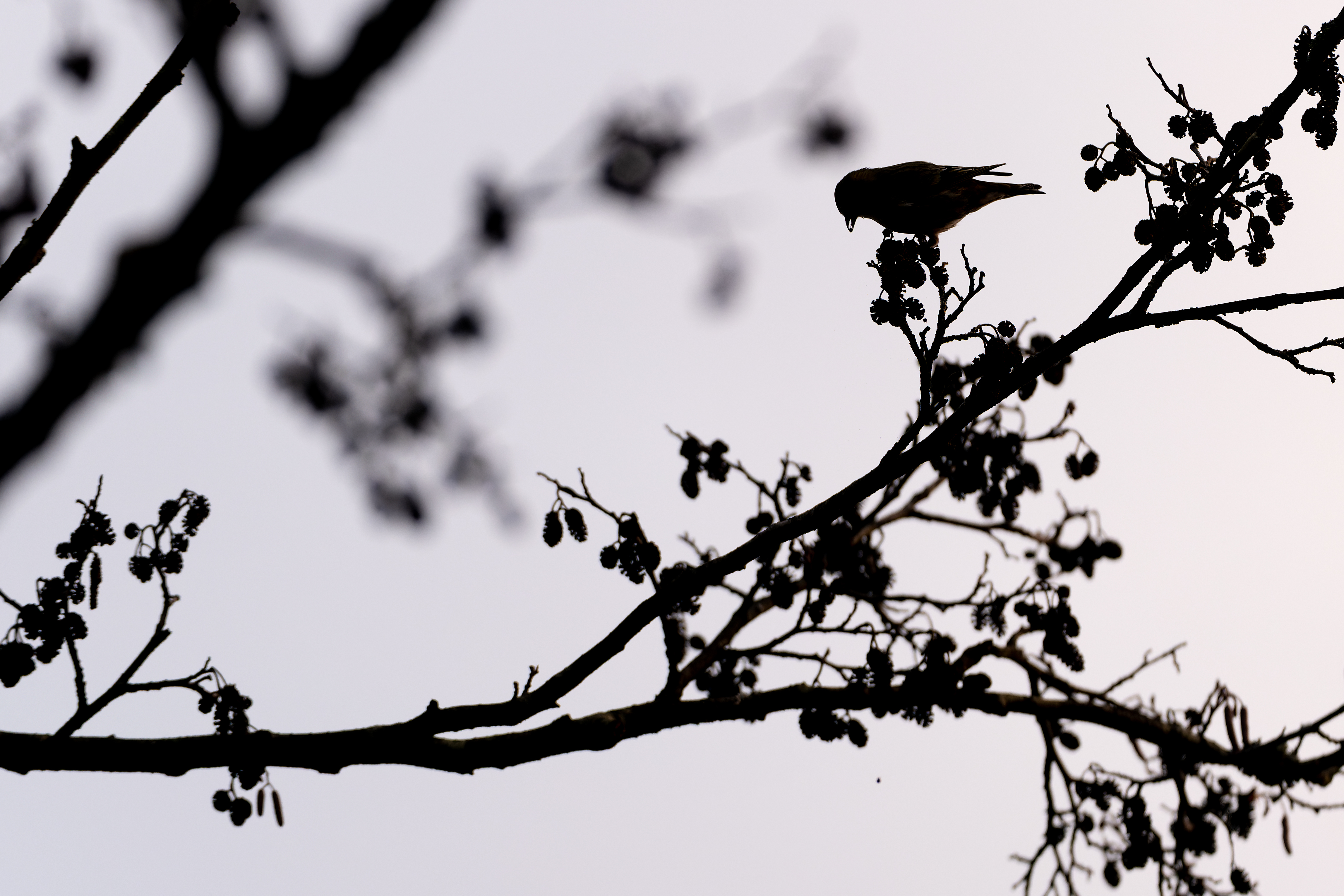 Mitten in einem Schwarm von Erlenzeisigen zu fotografieren ist gar nicht so einfach. Ich musste fast senkrecht nach oben zielen, aber dank der Kletterkünste der Zeisige war doch ab und zu ein Bild auf "Augenhöhe" möglich.